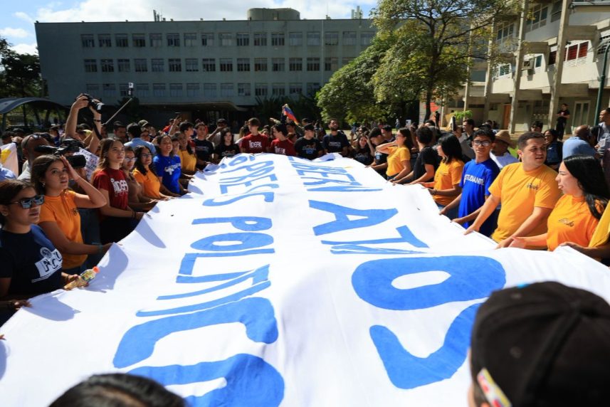 AME1515. CARACAS (VENEZUELA), 03/02/2026.- Persona participan en una manifestación convocada por el Movimiento Estudiantil de la Universidad Central de Venezuela, exigiendo la libertad de los presos políticos, este martes en Caracas (Venezuela). EFE/ Miguel Gutiérrez