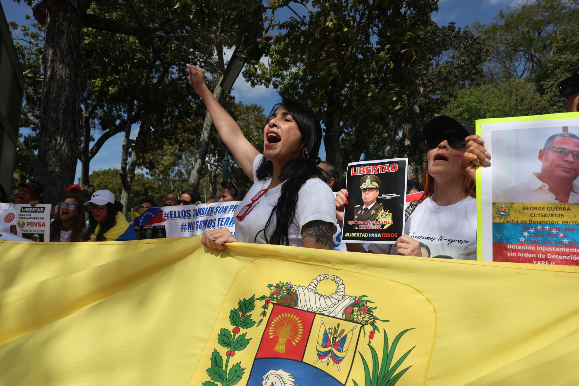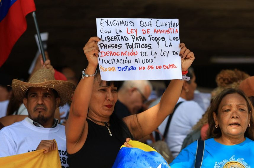 AME1512. CARACAS (VENEZUELA), 03/02/2026.- Una persona sostiene un cartel durante una manifestación convocada por el Movimiento Estudiantil de la Universidad Central de Venezuela, exigiendo la libertad de los presos políticos, este martes en Caracas (Venezuela). EFE/ Miguel Gutiérrez