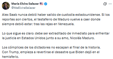 La congresista estadounidense María Elvira Salazar se pronunció a través de su cuenta en X respecto a los reportes que sugieren la nueva captura de Alex Saab.