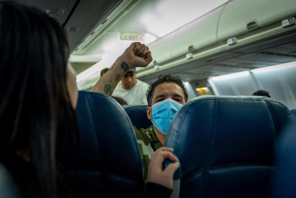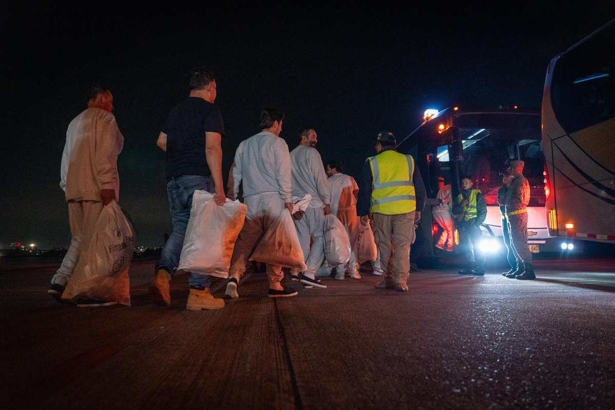 Según las imágenes difundidas por la Cancillería, la mayoría de los retornados descendieron del avión con chándales grises de los centros de detención en los que estaban recluidos en Estados Unidos y portando grandes sacos plásticos con sus pertenencias.
