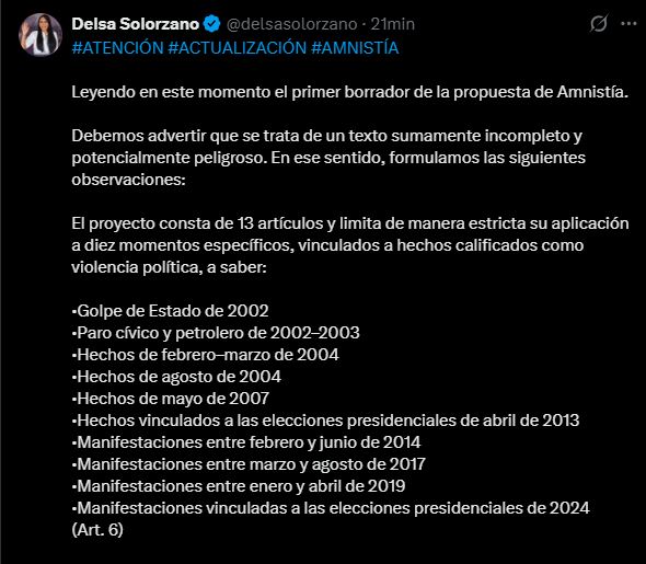 La presidenta del partido Encuentro Ciudadano y defensora de derechos humanos, Delsa Solórzano, fijó posición a través de su cuenta oficial en X (antes Twitter) sobre el primer borrador de la propuesta de Amnistía General que circula en el ámbito político venezolano.