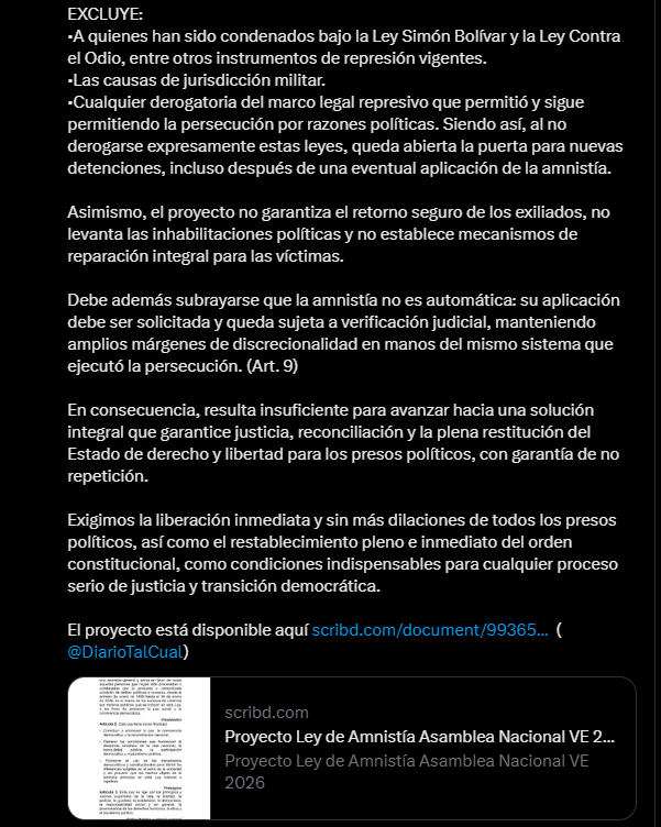 Solórzano, de profesión abogada, calificó el texto como «sumamente incompleto y potencialmente peligroso», señalando que, lejos de garantizar una solución integral, el proyecto deja vacíos legales que podrían perpetuar la persecución política.