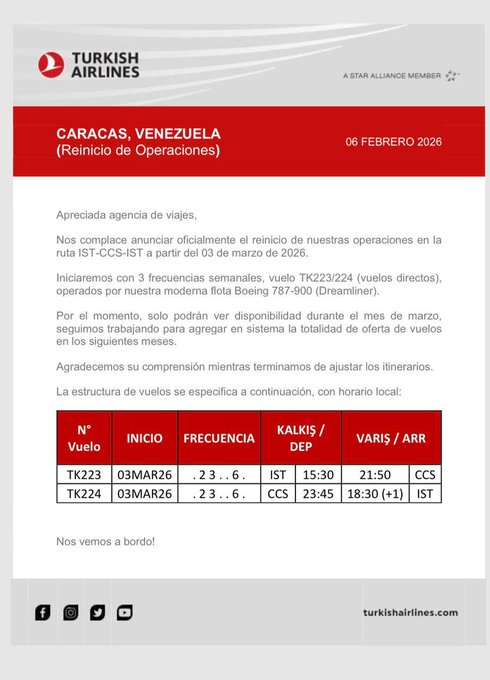 La aerolínea Turkish Airlines informó que retomará sus operaciones comerciales en la ruta Estambul-Caracas a partir del próximo 3 de marzo de 2026. La compañía emitió un comunicado dirigido a las agencias de viajes en el que confirmó la reactivación de la conexión aérea entre Turquía y Venezuela mediante vuelos directos.