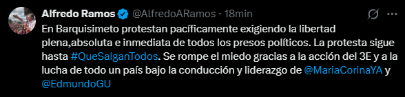 La información fue difundida a través de la cuenta oficial en X (antes Twitter) del exalcalde del municipio Iribarren y expreso político, Alfredo Ramos, quien aseguró que la manifestación continúa activa bajo la consigna #QueSalganTodos.