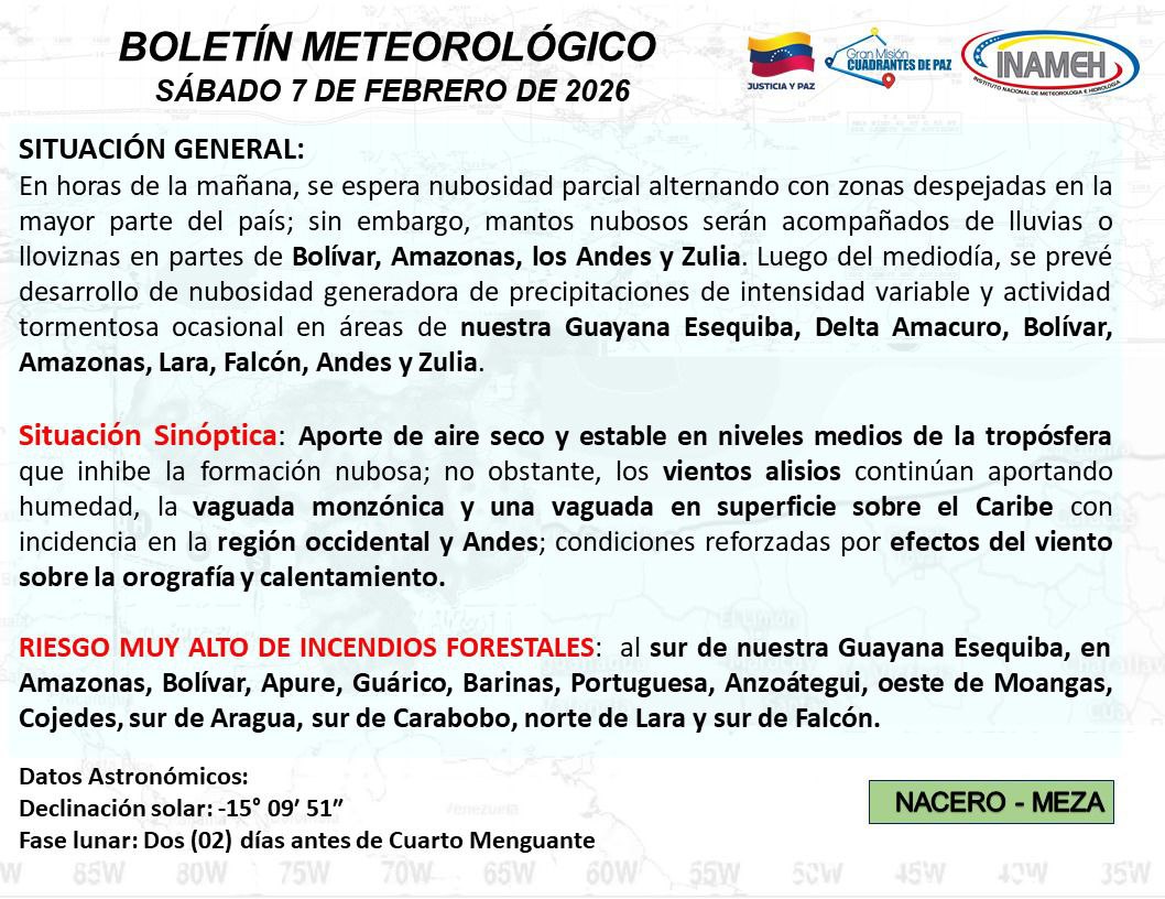 El Instituto Nacional de Meteorología e Hidrología (Inameh) informó que Venezuela amaneció este sábado 7 de febrero con nubosidad parcial y algunas zonas despejadas en gran parte del territorio nacional, aunque se mantienen áreas con condiciones meteorológicas inestables.