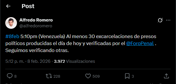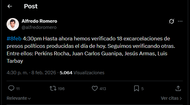 La ONG venezolana Foro Penal, dedicada a la defensa de los derechos humanos y al monitoreo de presos políticos, ha verificado al menos 35 excarcelaciones de personas detenidas por motivos políticos durante este domingo 8 de febrero, según informó el abogado y Director Presidente de la organización, Alfredo Romero.