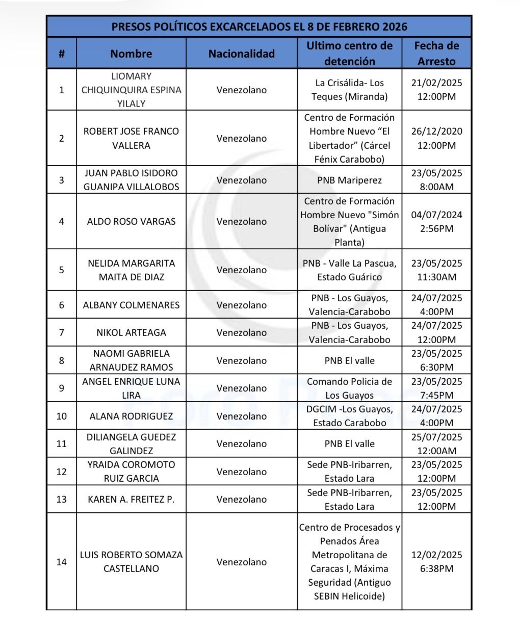 Este anuncio forma parte de un proceso de excarcelaciones que Foro Penal ha estado reportando desde el 8 de enero de 2026, fecha en la que se inició un ciclo de liberaciones tras el cambio político en Venezuela, luego de que Nicolás Maduro terminara arrestado en operativo militar de EEUU la madrugada del 3 de enero.