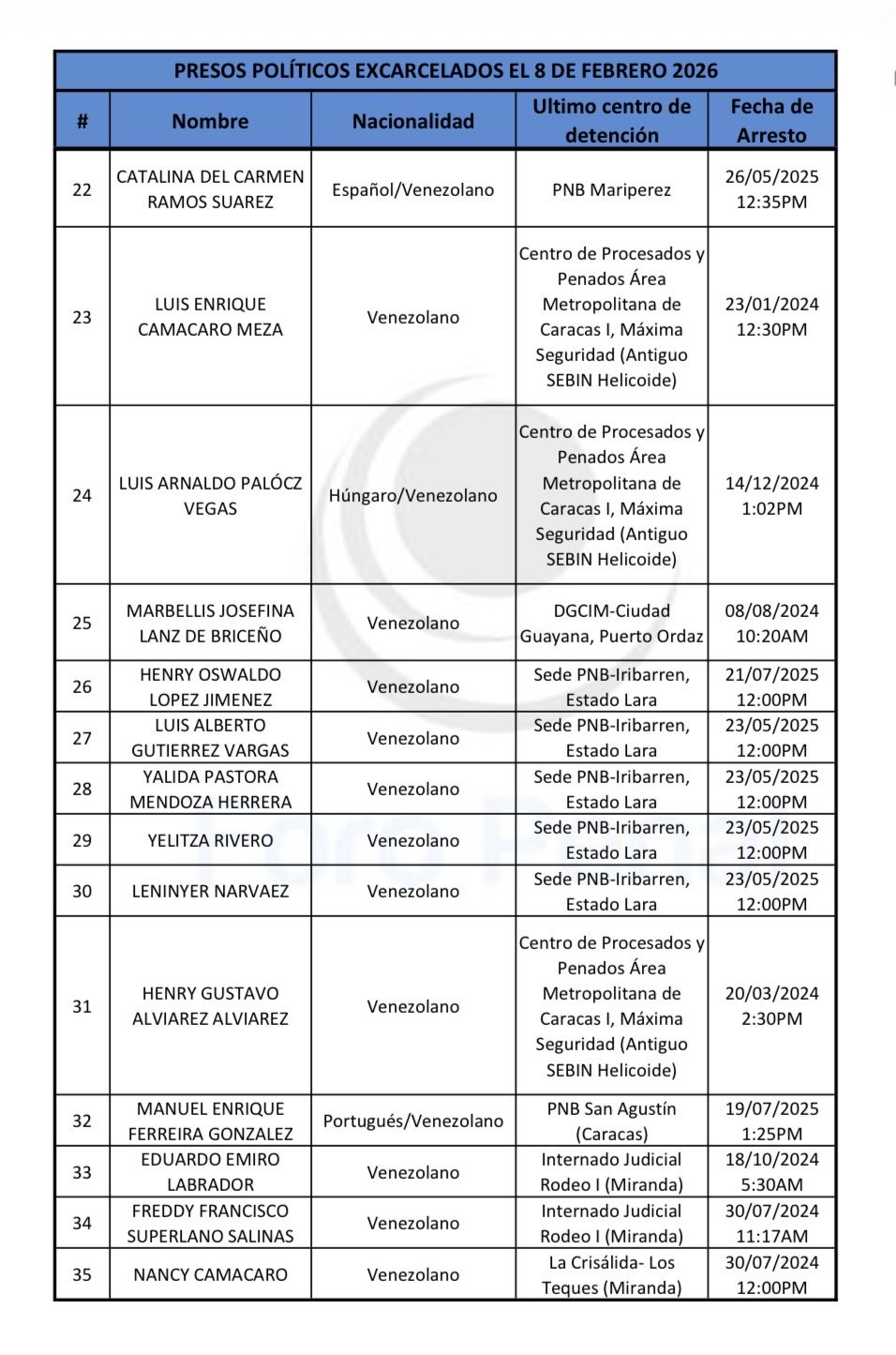 La ONG venezolana Foro Penal, dedicada a la defensa de los derechos humanos y al monitoreo de presos políticos, ha verificado al menos 35 excarcelaciones de personas detenidas por motivos políticos durante este domingo 8 de febrero, según informó el abogado y Director Presidente de la organización, Alfredo Romero.