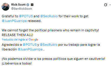 «Agradecido a @POTUS (Presidente de EEUU) y @SecRubio por su trabajo para lograr la liberación de Juan Pablo Guanipa», expresó Scott.