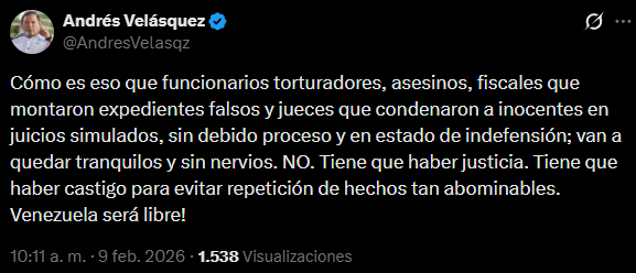«¿Cómo es eso que funcionarios torturadores, asesinos, fiscales que montaron expedientes falsos y jueces que condenaron a inocentes en juicios simulados, sin debido proceso y en estado de indefensión, van a quedar tranquilos y sin nervios?», cuestionó Velásquez en una publicación en X.