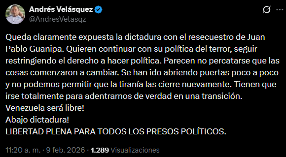 Velásquez también se pronunció ante la nueva desaparición forzada de Juan Pablo Guanipa, líder de Primero Justicia (PJ) que solo estuvo unas pocas horas excarcelado.