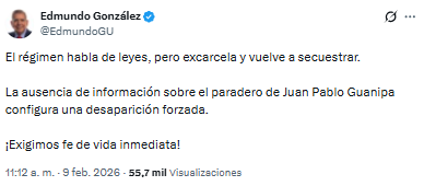 «El régimen habla de leyes, pero excarcela y vuelve a secuestrar. La ausencia de información sobre el paradero de Juan Pablo Guanipa configura una desaparición forzada. ¡Exigimos fe de vida inmediata!», señaló en su cuenta de X.