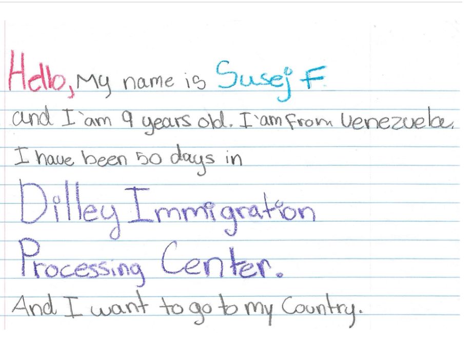 Entre ellas se encontraba una carta de una niña venezolana de 9 años, llamada Susej Fernández, que vivía en Houston cuando ella y su madre fueron detenidas. «Llevo 50 días en el Centro de Procesamiento de Inmigración de Dilley», escribió. «Ver cómo tratan a personas como yo, inmigrantes, ha cambiado mi perspectiva sobre Estados Unidos. Mi madre y yo vinimos a Estados Unidos buscando un lugar bueno y seguro para vivir».