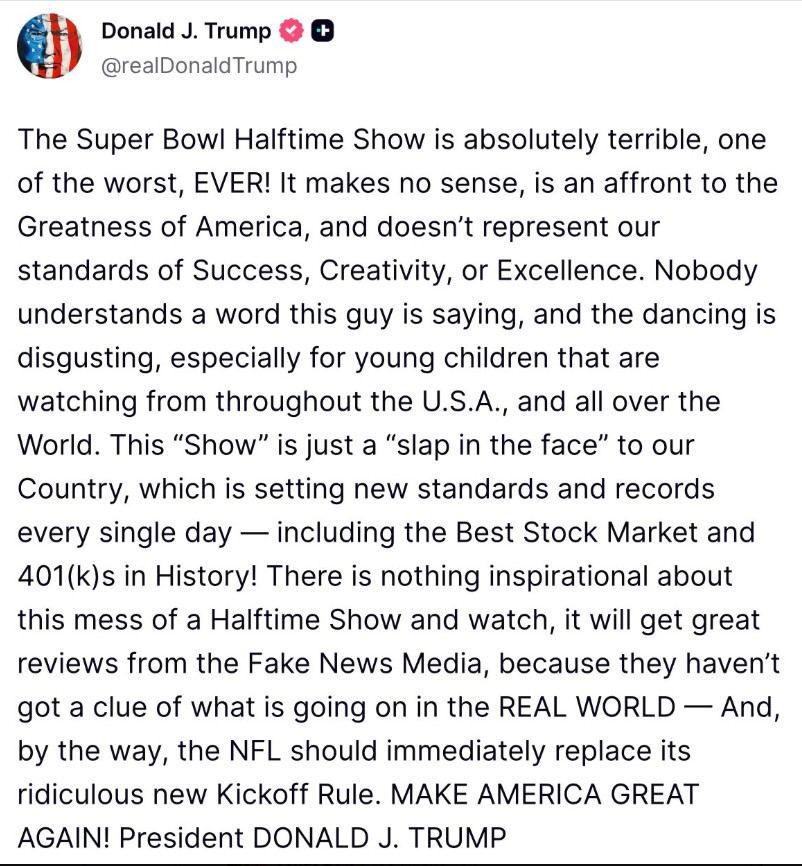 “El show de medio tiempo del Super Bowl es absolutamente terrible, ¡uno de los peores de la historia! No tiene sentido, es una afrenta a la grandeza de Estados Unidos y no representa nuestros estándares de éxito, creatividad ni excelencia”, escribió Trump en Truth Social. “Este ‘show’ es solo una ‘bofetada en la cara’ para nuestro país, que está estableciendo nuevos estándares y récords cada día”.