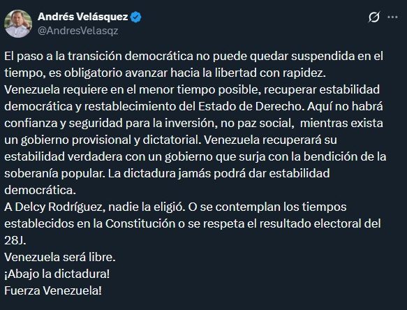 “Venezuela requiere en el menor tiempo posible, recuperar la estabilidad democrática y restablecimiento del Estado de Derecho. Aquí no habrá confianza y seguridad para la inversión, no (habrá) paz social, mientras exista un gobierno provisional y dictatorial”, dijo el exdiputado a través de un mensaje publicado en su cuenta personal en X.