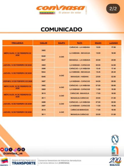 Conviasa emitió un comunicado informando la reprogramación de sus vuelos en la ruta Caracas – La Habana – Managua y sus respectivos retornos, programados originalmente entre el 10 y el 19 de febrero de 2026.