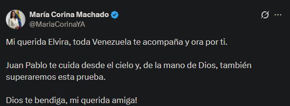 “Mi querida Elvira, toda Venezuela te acompaña y ora por ti. Juan Pablo te cuida desde el cielo y, de la mano de Dios, también superaremos esta prueba. Dios te bendiga, mi querida amiga”, escribió.