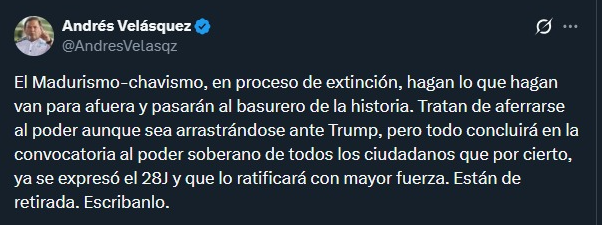 “Tratan de aferrarse al poder aunque sea arrastrándose ante Trump, pero todo concluirá en la convocatoria al poder soberano de todos los ciudadanos que por cierto, ya se expresó el 28J y que lo ratificará con mayor fuerza. Están de retirada. Escribanlo”, publicó el exdiputado a través de su cuenta personal en X.