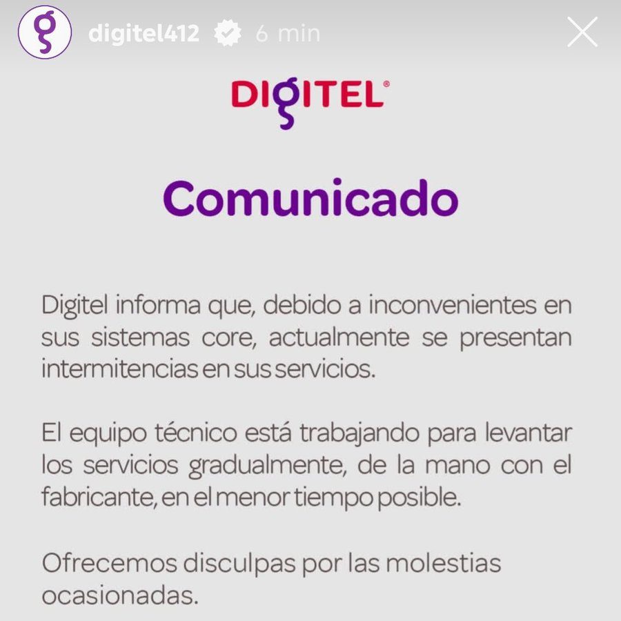 Digitel resaltó que el equipo técnico de la empresa ya se encuentra trabajando en la solución del inconveniente.