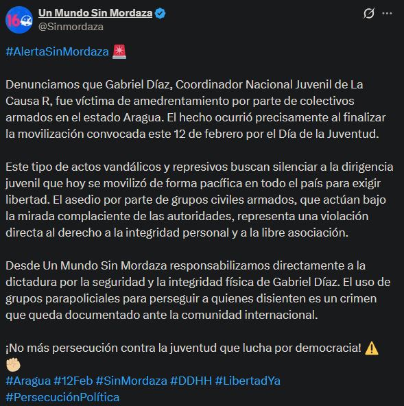 “Desde Un Mundo Sin Mordaza responsabilizamos directamente a la dictadura por la seguridad y la integridad física de Gabriel Díaz. El uso de grupos parapoliciales para perseguir a quienes disienten es un crimen que queda documentado ante la comunidad internacional”, expresó la organización.