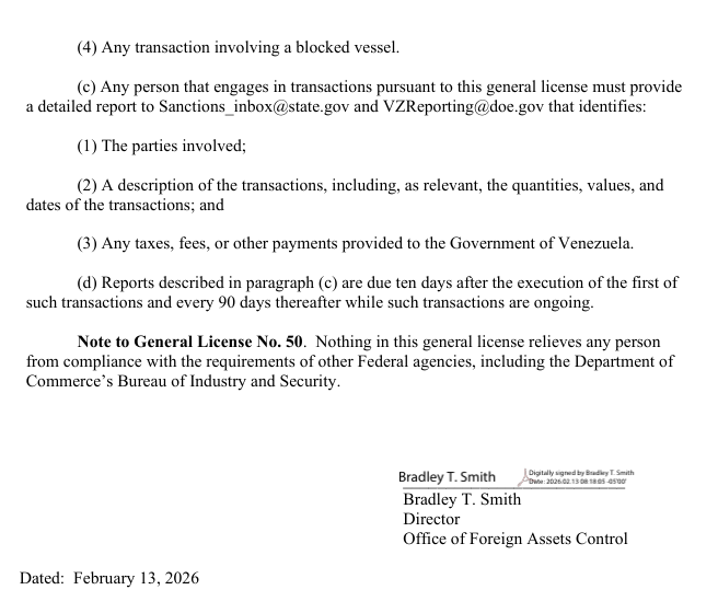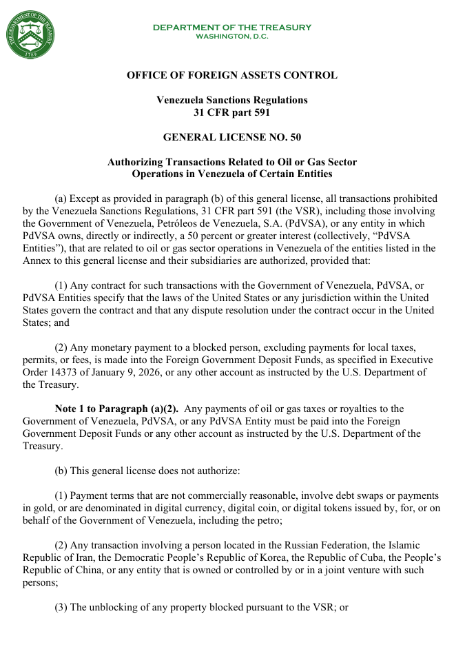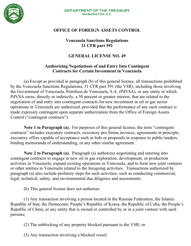 La otra licencia permite a empresas de todo el mundo firmar contratos con la petrolera estatal PDVSA para nuevas inversiones en el petróleo y gas venezolanos. Los contratos dependen de permisos separados de OFAC.