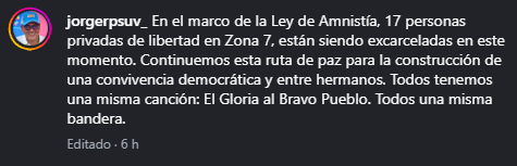 «En el marco de la Ley de Amnistía, 17 personas privadas de libertad en Zona 7, están siendo excarceladas en este momento», anunció Rodríguez en una breve publicación en Instagram.