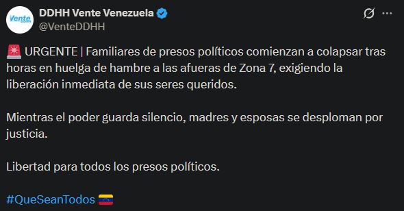 «Familiares de presos políticos comienzan a colapsar tras horas en huelga de hambre a las afueras de Zona 7, exigiendo la liberación inmediata de sus seres queridos. Mientras el poder guarda silencio, madres y esposas se desploman por justicia», escribió.