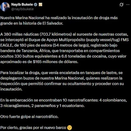 Durante el procedimiento de abordaje y revisión se identificó a 10 ocupantes vinculados al narcotráfico, entre ellos cuatro colombianos, tres nicaragüenses, dos panameños y un ecuatoriano. La participación de tripulantes de diversas nacionalidades refuerza la dimensión internacional de la incautación. El presidente Bukele celebró el éxito de la operación señalando: “Otro fuerte golpe al narcotráfico”.