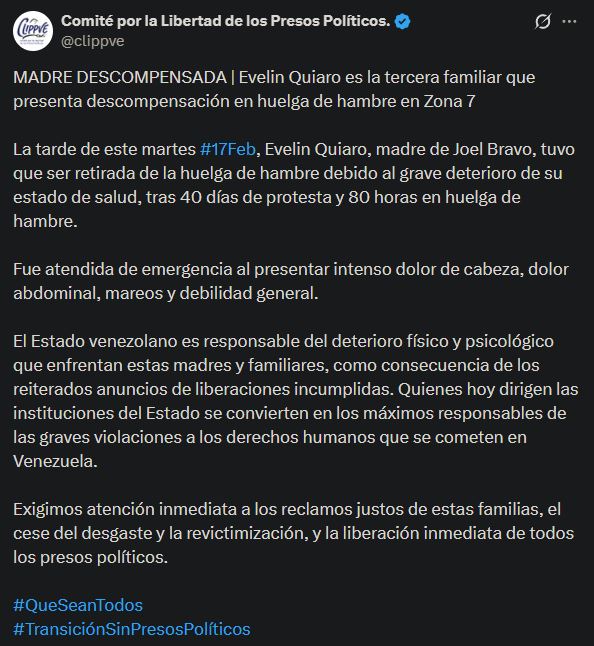 El Comité por la Libertad de los Presos Políticos en Venezuela (Clippve) alertó este martes que una tercera madre se descompensó tras más de 80 horas en huelga de hambre en las adyacencias de Zona 7, sede de la Policía Nacional Bolivariana (PNB) en Boleíta, estado Miranda.