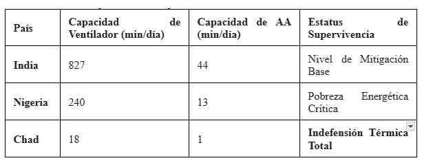 La diferencia entre 18 minutos (Chad) y 827 minutos (India) de ventilación es la diferencia entre la dignidad y el sufrimiento. La implementación masiva de Enfriamiento Solar Descentralizado no es solo una opción ambientalista; es la única vía para romper el círculo vicioso que condena a las naciones más pobres a morir de calor en un planeta que ellas no ayudaron a calentar.