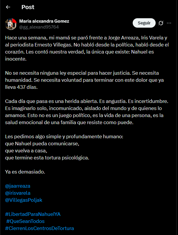 La publicación de María Alexandra concluyó con etiquetas como #LibertadParaNahuelYA, #QueSeanTodos y #CierrenLosCentrosDeTortura, pidiendo visibilidad y presión internacional.