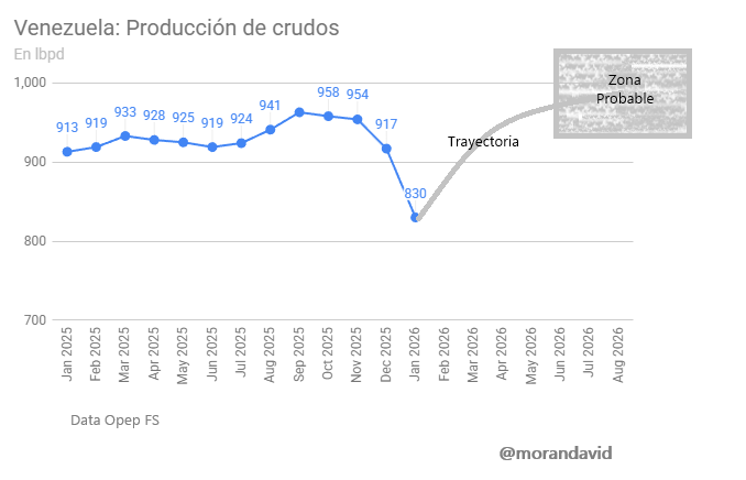 Luego de alcanzar un pico reciente en Octubre (958 kbpd) y Noviembre (954 kbpd) la producción petrolera se desplomó en enero 2026 principalmente por la cuarentena naval impuesta por EEUU,