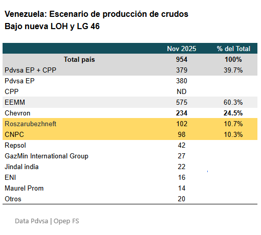 Sin repuestos: La LG 48 prohíbe servicios de mantenimiento a estas entidades. Esto significa que su capacidad de mantener esos 200.000 bpd irá decayendo por obsolescencia, mientras que las mixtas con socios occidentales (Chevron, Repsol, Eni, BP, Shell) verán un repunte.