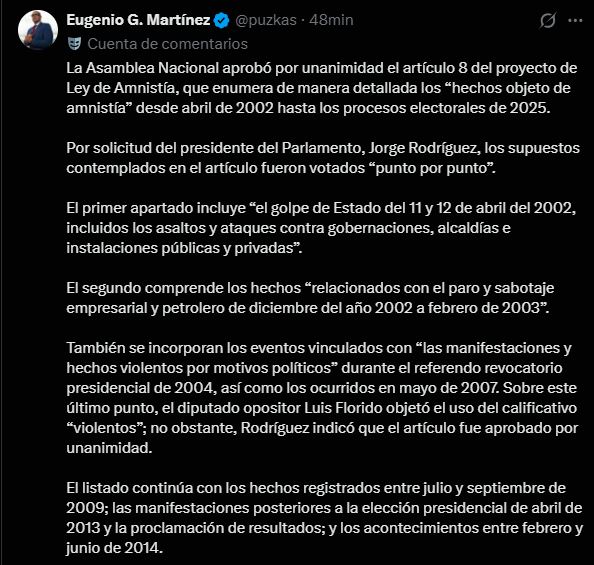 El artículo 8 del proyecto de ley de amnistía enumera los hechos políticos que serían amnistiados si la normativa es aprobada. La lista incluye una serie de eventos históricos de protestas y manifestaciones desde 2002 hasta 2025, como: