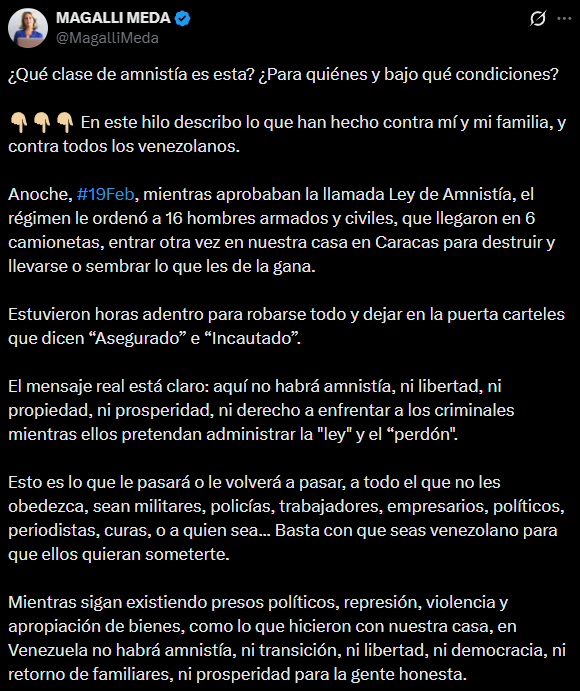 «Anoche, 19 de febrero, mientras aprobaban la llamada Ley de Amnistía, el régimen les ordenó a 16 hombres armados y civiles, que llegaron en seis camionetas, entrar otra vez en nuestra casa en Caracas para destruir y llevarse o sembrar lo que les dé la gana», alertó Meda en sus redes sociales.