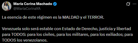 «Venezuela solo será estable con Estado de Derecho, justicia y libertad para TODOS: para los civiles, para los militares, para los exiliados; para TODOS los venezolanos», sentenció la Premio Nobel de la Paz 2025 a través de su cuenta en X.