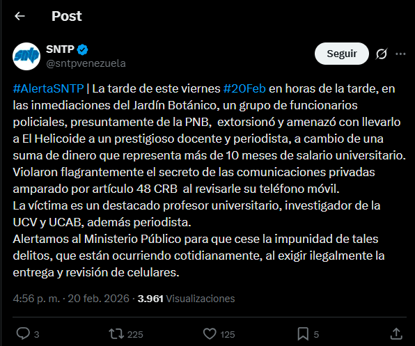 El Sindicato Nacional de Trabajadores de la Prensa (Sntp) denunció que la tarde de este viernes 20 de febrero, un destacado periodista y docente universitario fue víctima de extorsión y amenazas por parte de presuntos funcionarios de la Policía Nacional Bolivariana (PNB).