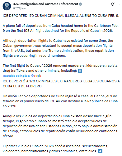 “Aunque los vuelos de deportación a Cuba existen desde hace algún tiempo, el Gobierno cubano se mostró reacio a aceptar vuelos de deportación masiva desde Estados Unidos, pero bajo la Administración de Trump, estos vuelos de repatriación están ocurriendo en cantidades récord”, dijo el ICE en su cuenta de X.