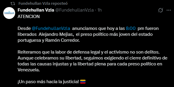 La Fundación de Derechos Humanos Los Llanos (Fundehullan) anunció este domingo 22 de febrero en su cuenta oficial de X, la liberación de dos activistas políticos, entre ellos Alejandro Mejías, considerado el preso político más joven del estado Portuguesa, y Ramón Corredor.