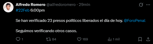 En el mensaje publicado a las 6:00 de la tarde, Romero señaló: “#22Feb 6:00pm Se han verificado 23 presos políticos liberados el día de hoy. @ForoPenal Seguimos verificando otros casos”.