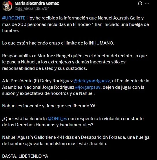 “Lo que están haciendo cruzó el límite de lo INHUMANO. Responsabilizo a Martinez Rangel quién es el director del recinto, lo que le pase a Nahuel, a los extranjeros y demás inocentes sólo es responsabilidad de usted y sus custodios”, dijo María Alexandra Gómez, a través de su cuenta en X.