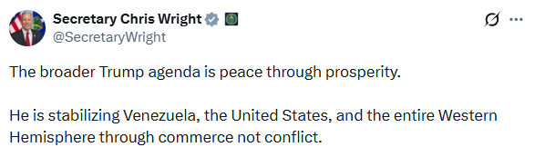En un mensaje sobre la política exterior, el alto funcionario compartió la visión del actual gobierno norteamericano sobre el continente. «La agenda más amplia de Trump es la paz a través de la prosperidad. Él estabiliza a Venezuela, a Estados Unidos y a todo el hemisferio occidental a través del comercio, no del conflicto», escribió Wright.