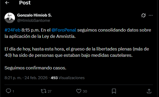 “En el Foro Penal seguimos consolidando datos sobre la aplicación de la Ley de Amnistía. El día de hoy, hasta esta hora, el grueso de las libertades plenas (más de 40) ha sido de personas que estaban bajo medidas cautelares. Seguimos confirmando casos”, escribió el abogado en la red social.