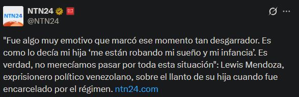Lewis Mendoza, expreso político y jefe del Comando ConVzla en el municipio Miranda del estado Trujillo, compartió este martes un emotivo testimonio sobre el impacto que tuvo su injusto encarcelamiento en su familia, especialmente en su hija.