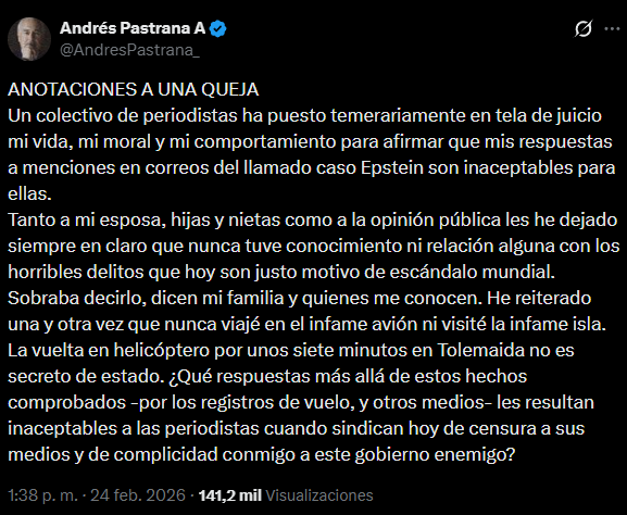 El expresidente colombiano Andrés Pastrana (1998-2002) negó cualquier relación con los delitos cometidos por el pederasta estadounidense Jeffrey Epstein y cuestionó a un colectivo de periodistas que, según dijo, ha puesto en duda su conducta a raíz de la aparición de su nombre en documentos desclasificados del caso.