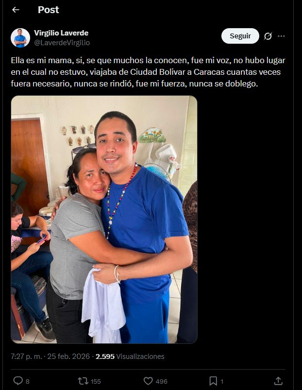 El expreso político venezolano Virgilio Laverde conmovió a miles de usuarios en redes sociales la noche del miércoles 25 de febrero, al publicar un mensaje dedicado a su madre, protagonista clave en su lucha por la libertad durante su proceso de detención arbitraria en Venezuela.