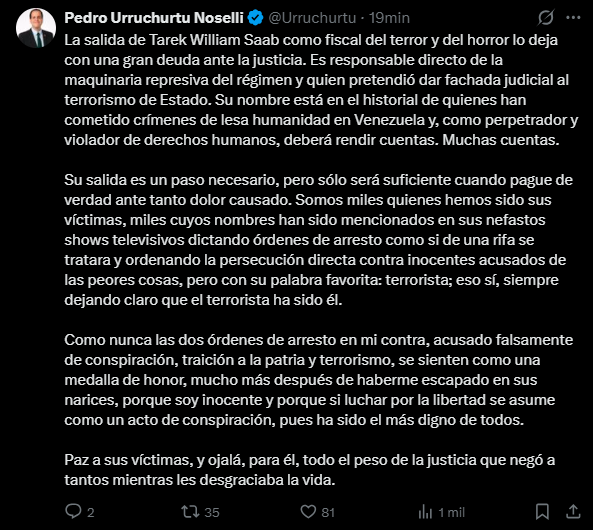 En su publicación, Urruchurtu calificó a Saab como el responsable de una “maquinaria represiva” que, según el dirigente opositor, dio una apariencia judicial al “terrorismo de Estado” durante los últimos años. Urruchurtu subrayó que Saab queda con una “gran deuda ante la justicia” y debe rendir cuentas por crímenes de lesa humanidad atribuidos a su gestión en la Fiscalía General.