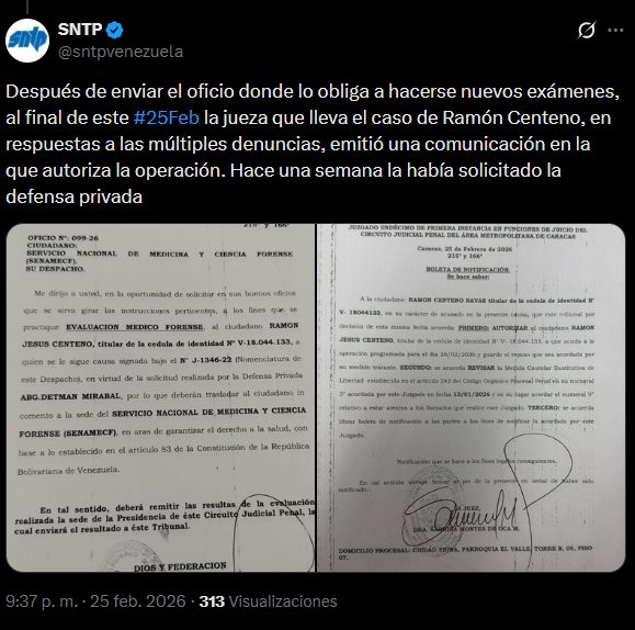 El Sindicato Nacional de Trabajadores de la Prensa (Sntp) confirmó que el tribunal a cargo del caso del periodista Ramón Centeno autorizó su intervención quirúrgica. La jueza emitió la aprobación oficial al final de la jornada de este miércoles 25 de febrero, luego de las múltiples denuncias públicas sobre el caso.