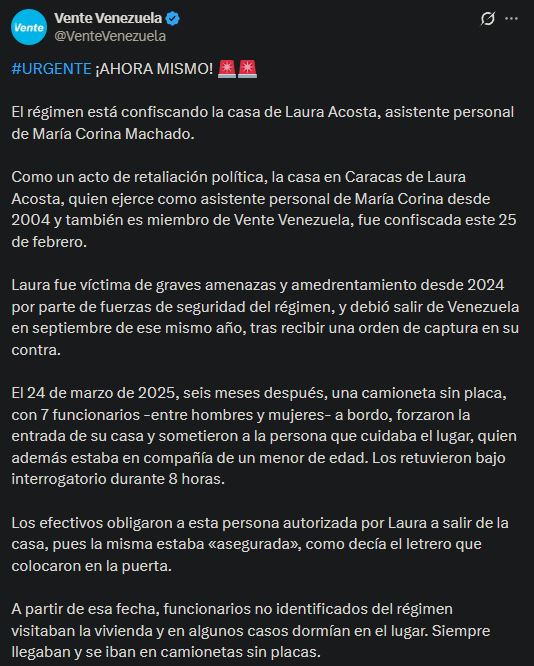 Vente Venezuela denunció este miércoles que el régimen chavista confiscó la vivienda de Laura Acosta, asistente personal de la líder opositora María Corina Machado desde 2004 y también miembro de esa organización, ubicada en Caracas, en lo que calificó como una represalia política.