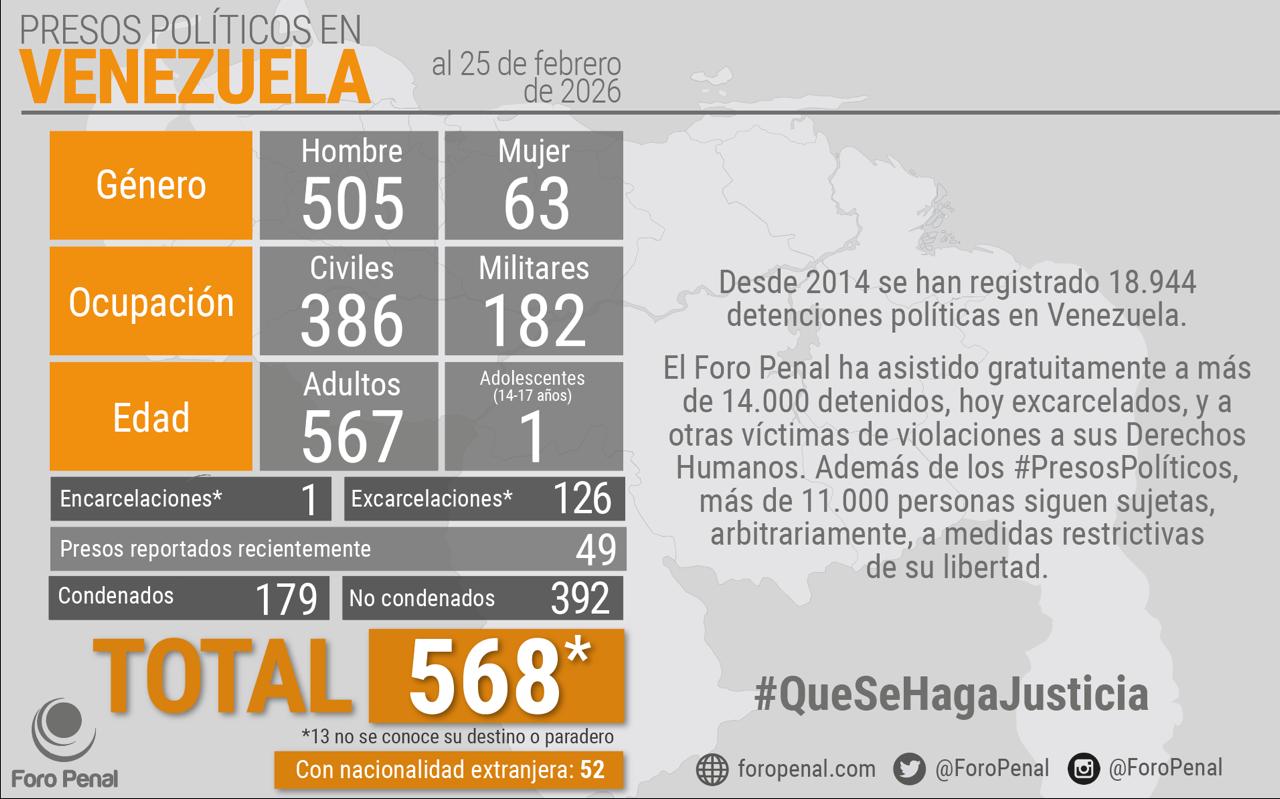 Según el reporte, con corte al 25 de febrero, la cifra total de presos políticos se ubica en 568 personas.